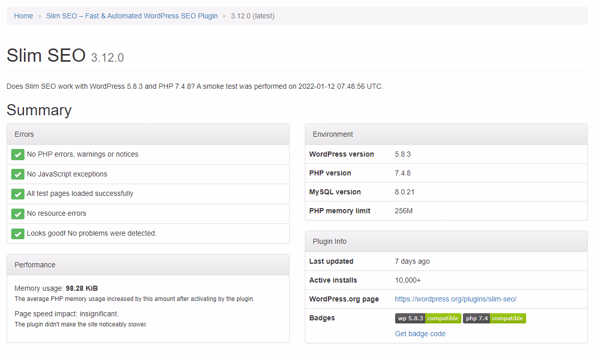 例如,我搜索一款插件,Slim SEO,可以看到多个历史版本的测试数据,并对某各版本进行了评价。