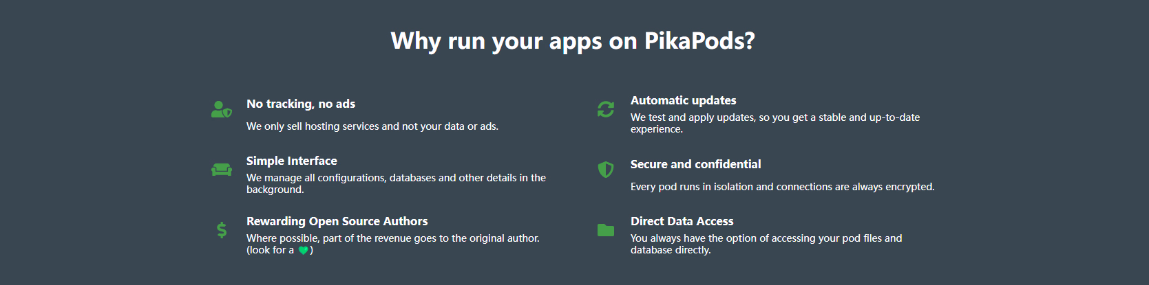 就像官网的介绍一样,PikaPods是一款省心的产品,值得使用。当然你需要忍受国内访问慢、信用卡或者paypal付款等国内环境使用上的不足。