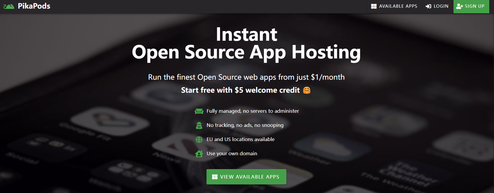 PikaPods可以一键运行开源应用程序,目前有几十款程序可以直接运行。