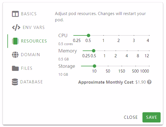 后台管理非常简单,直接就把相关参数都展示在你面前,然后可以在设置里面调整服务器cpu、内存等硬件配置、自定义域名、开放SFTP等操作。