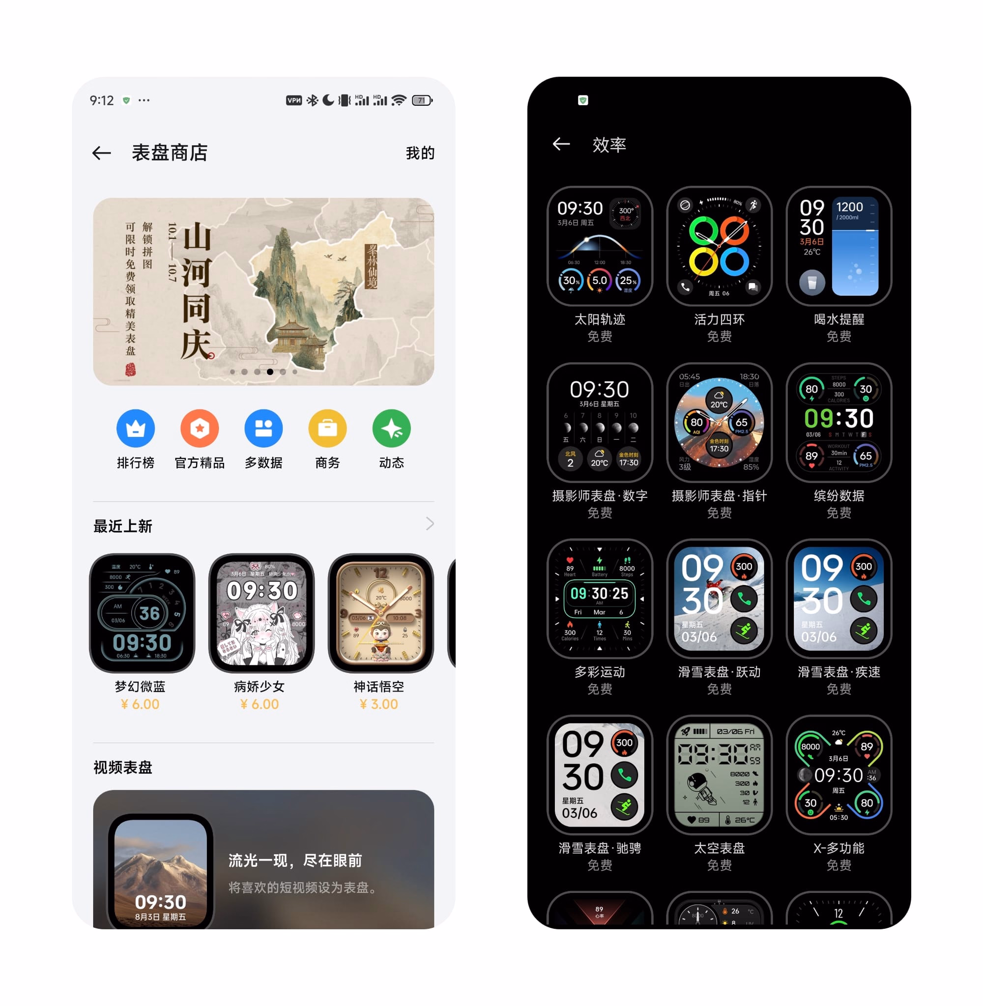 手表开启全智能模式后,就可以在手表或者手机app上打开表盘商店,里面上架了多款炫酷精美的表盘,尤其是这种数据类表盘,非常实用。